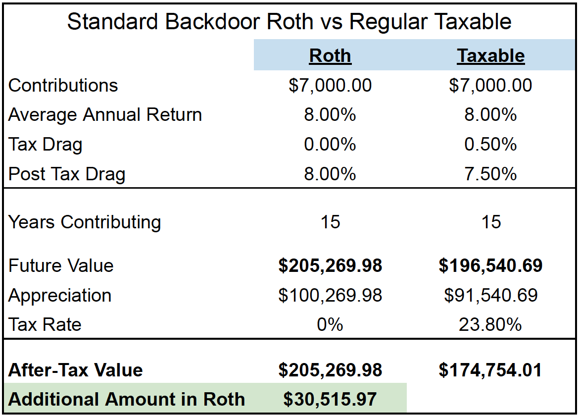 Here’s a quick comparison of just doing $7k into your regular, non-mega backdoor Roth.